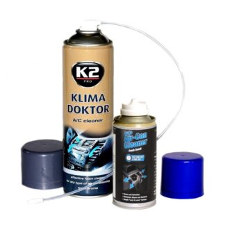 1. Spray Curatare Aer Conditionat Auto cu Spuma Activa – curata si igienizeaza instalatia de aer conditionat – cu furtun pentru injectarea in conductele de aer – distruge agentii patogeni ce se dezvolta in tubulatura instalatiei 2. Spray igienizare si neutralizare mirosuri interior auto – inlatura mirosurile neplacute din interorul autoturismului – tratament cu gaz, ce actioneaza si asupra tapiteriei