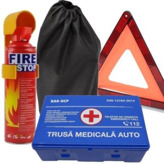 Pachet auto dotare obligatorie RAR-ITP : Contine trusa medicala auto valabila pana in iulie 2029 Stingator auto tip spray valabil pana in iulie 2029 Extinctorul este in conformitate cu normele EU Trusa sanitara este conforma EU, omologata RAR